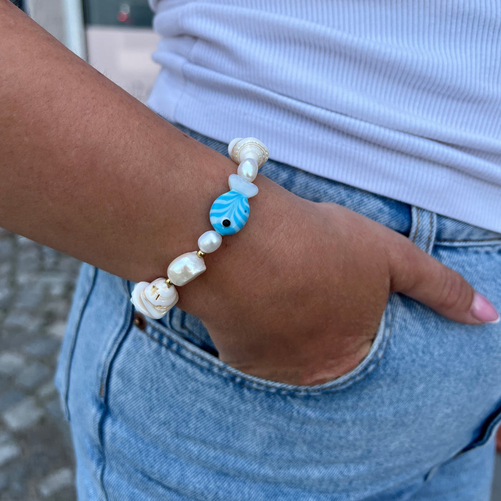 Kora armbånd med et mix af lyse ferskvandsperler der chanchere i størrelsen, skaller og en glasfisk.