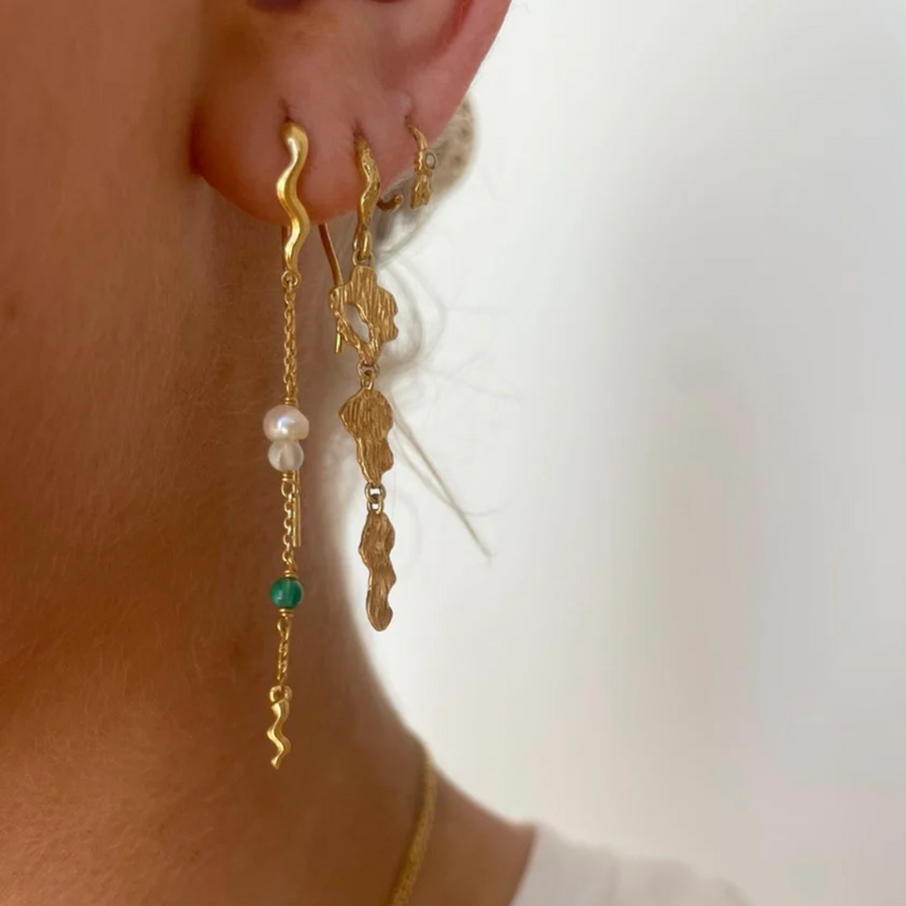 Forgyldt Ophelia øreringe er designet med detaljeret bølge i forlængelse af ferskvangsperle, lys prehnit sten og afsluttende grøn onyx med bølge for enden. Flotte og farverige øreringe som passer godt til både fest og hverdag.