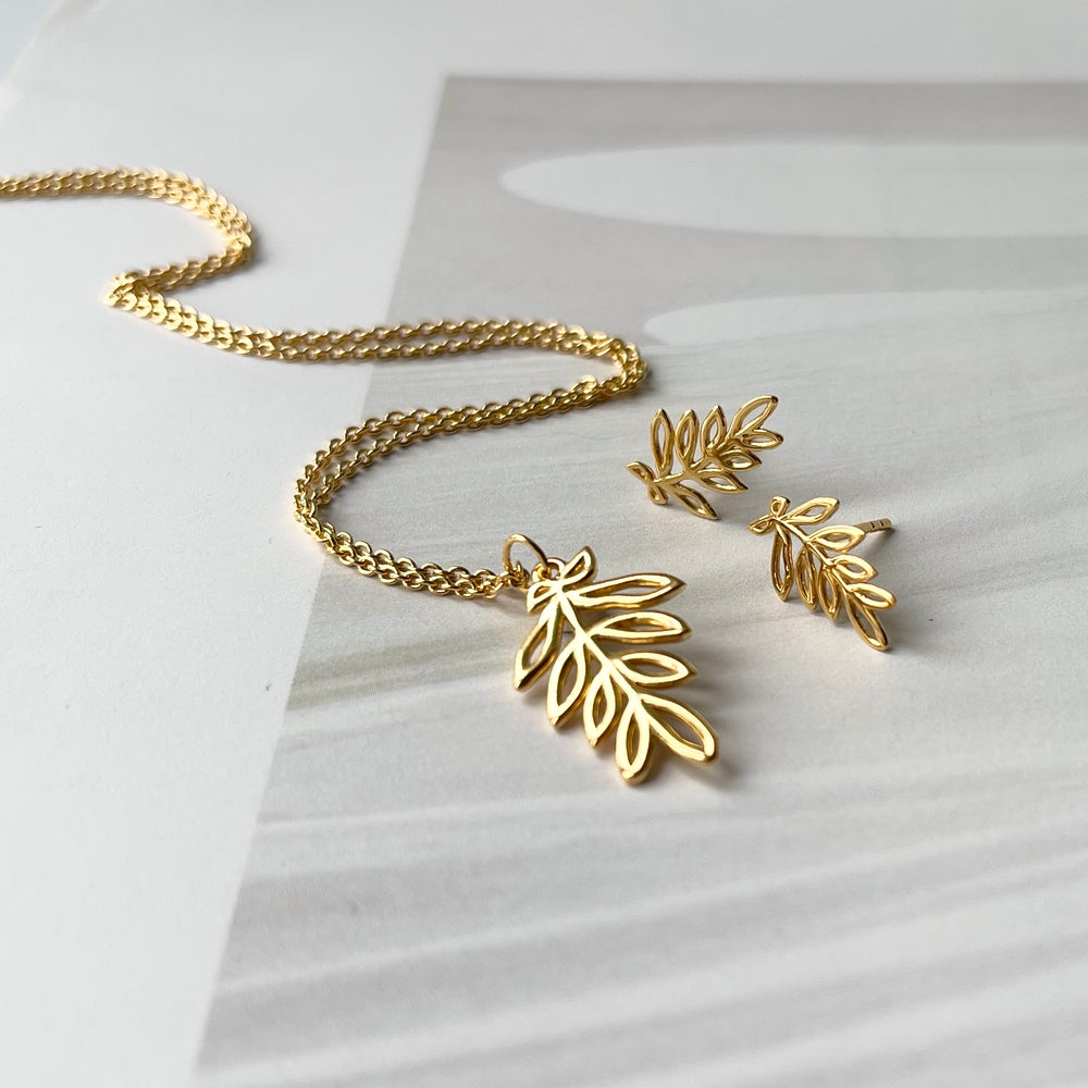 Det gennemgående design i Tamara kollektionen består af små fine blade på en lille gren. Kæden og vedhænget er fremstillet i 18 karat guldbelagt genbrugssølv.