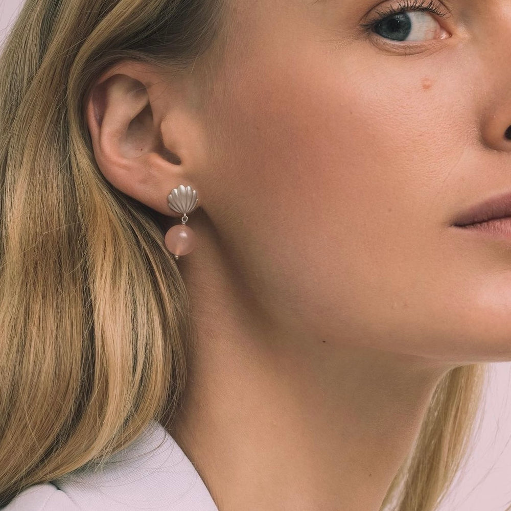 Smukke ørestikker med muslingskal design og perle i pink calcedon. Ørestikkerne er lavet i mat rhodiumbelagt sterling sølv.