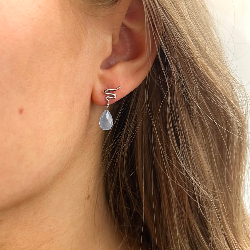 Elegante ørestikker i blankt rhodineret sterlingsølv fra Izabel Camille. Krogen består af en slangeformet bølget stav og er dekoreret afslutningsvis med en blå glaskrystal. SANIYA serien er en del af vores velgørenhedsarbejde - CHARITY.