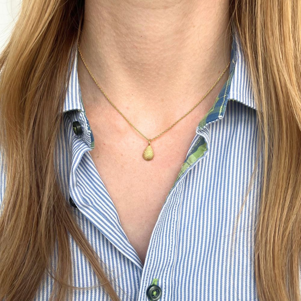 Oplev det eksklusive udtryk i denne halskæde med dråbeformet vedhæng med en fin struktureret overflade. Den subtile tekstur fremhæver smykkets form og giver et raffineret spil i lyset – et smykke, du kan bære sæson efter sæson.