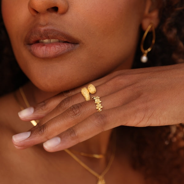 Denne ring med en elegante dråber, der former sig rundt om fingeren, er designet til alle, der ønsker smykker med et tidløst udtryk. Kombinationen af dråber og den strukturerede overflade, gør dem til et smykke, der skaber blikfang
