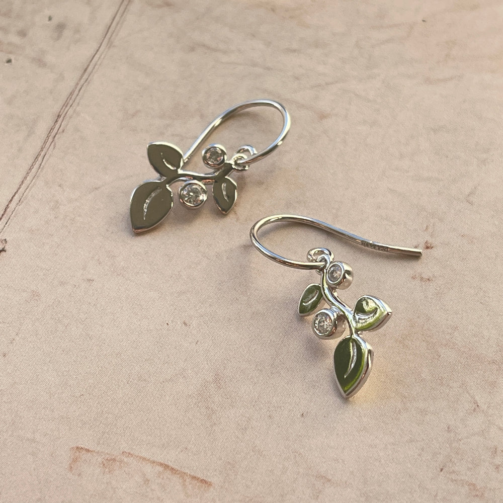 Elegante øreringe på krog, med design af blomsterblade og små hvide zirkoniaer.