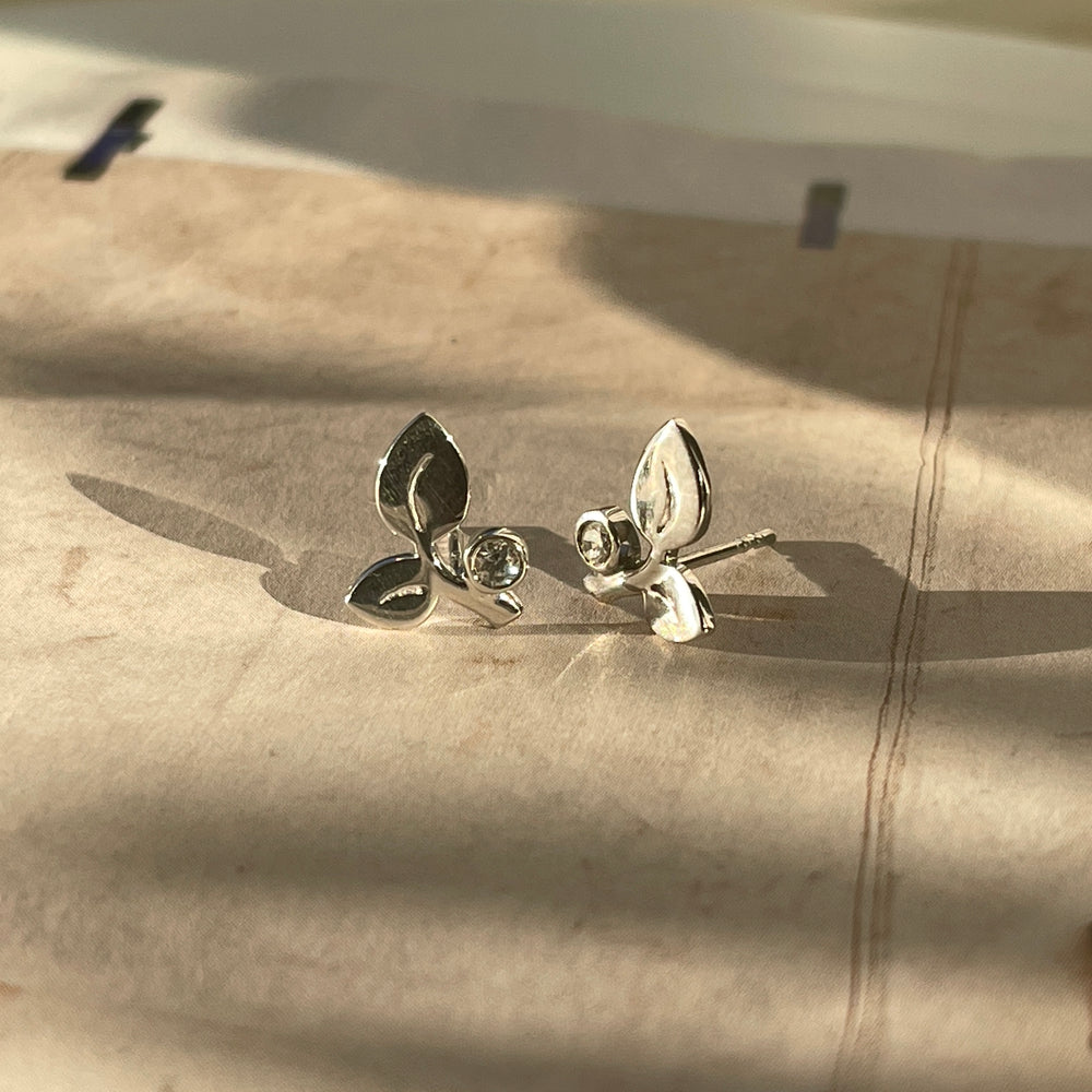 Elegante ørestikker med design af blomsterblade og lille hvid zirkonia.