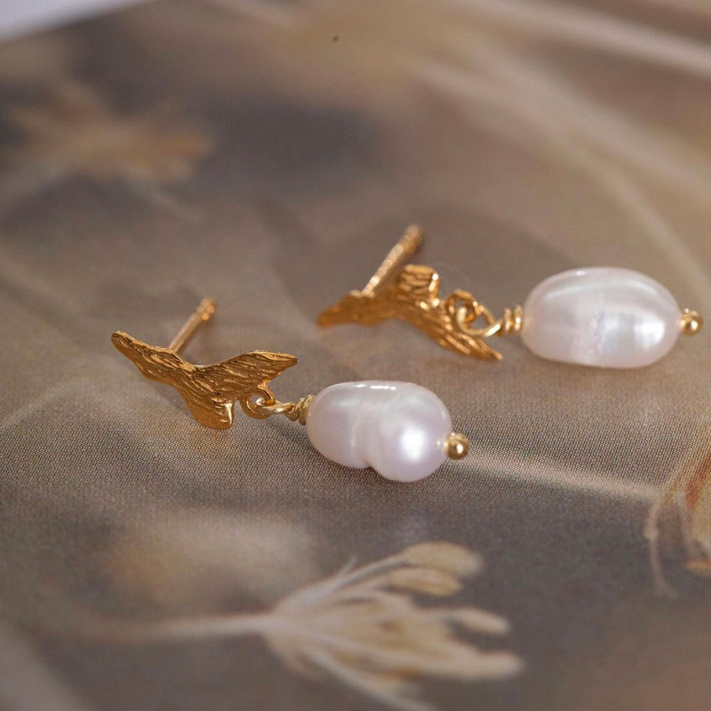 Ørestikkerne er fremstillet i 18kt guldbelagt genbrugssølv med en løsthængende barok ferskvandsperle.