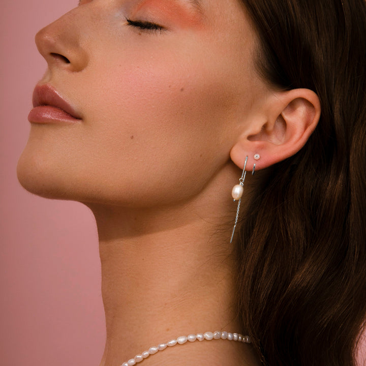 Smukke perleøreringe fremstillet i rhodiumbelagt genbrugssølv. Øreringen er designet med en kæde bag øret og en flot ferskvandsperle på forsiden. Øreringene har et naturligt og fint look, der passer til både hverdag og fest.