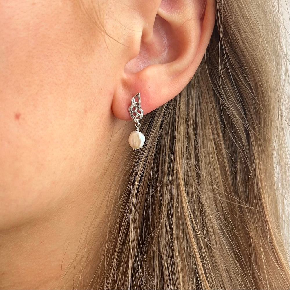 Skal du bruge et smukt og elegant udtryk til dit outfit? Disse ørestikker i organiske former er fremstillet i rhodiumbealgt sterlingsølv med lille fin barok perle.