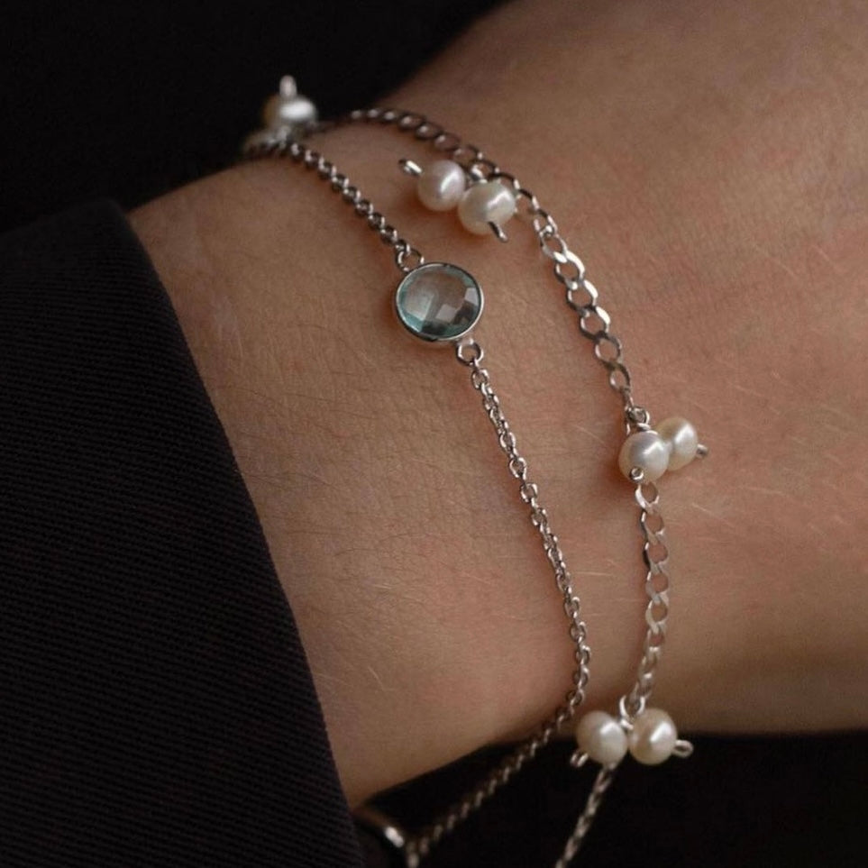 Armbånd fra Izabel Camille, fremstillet i sterlingsølv med hvide ferskvandsperler. De kan med fordel kombinesres med tilhørende Mary øreringe og halskæde fra Izabel Camille.