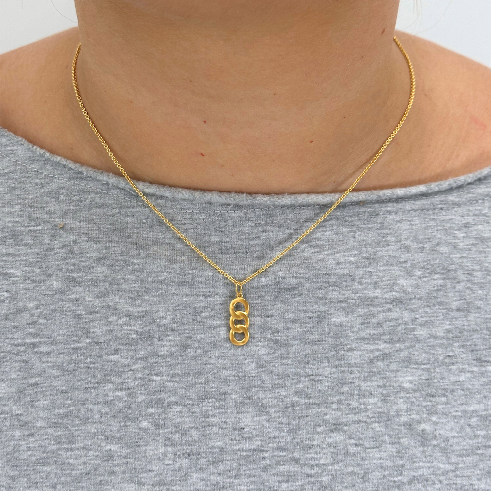 De 3 kædeled i vedhænget symboliserer styrke, forbundethed og kan fx. bruges som push-present med budskabet "Nu er vi 3 forbundet for evigt, lige meget hvad fremtiden bringer" - Sofie Schwartz.