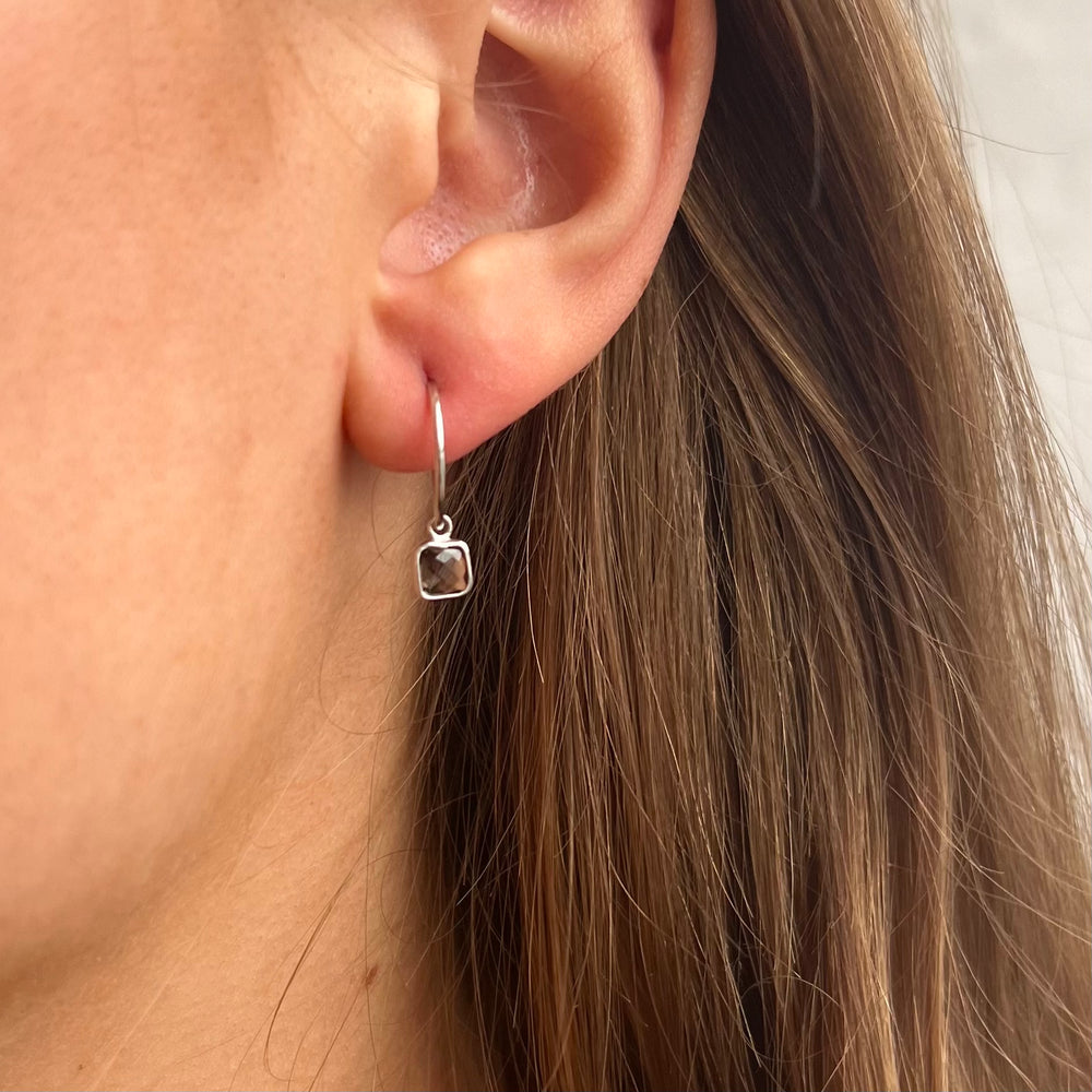 Beautiful hoop earrings in rhoidum-coated sterling silver with a smoky quartz stone.