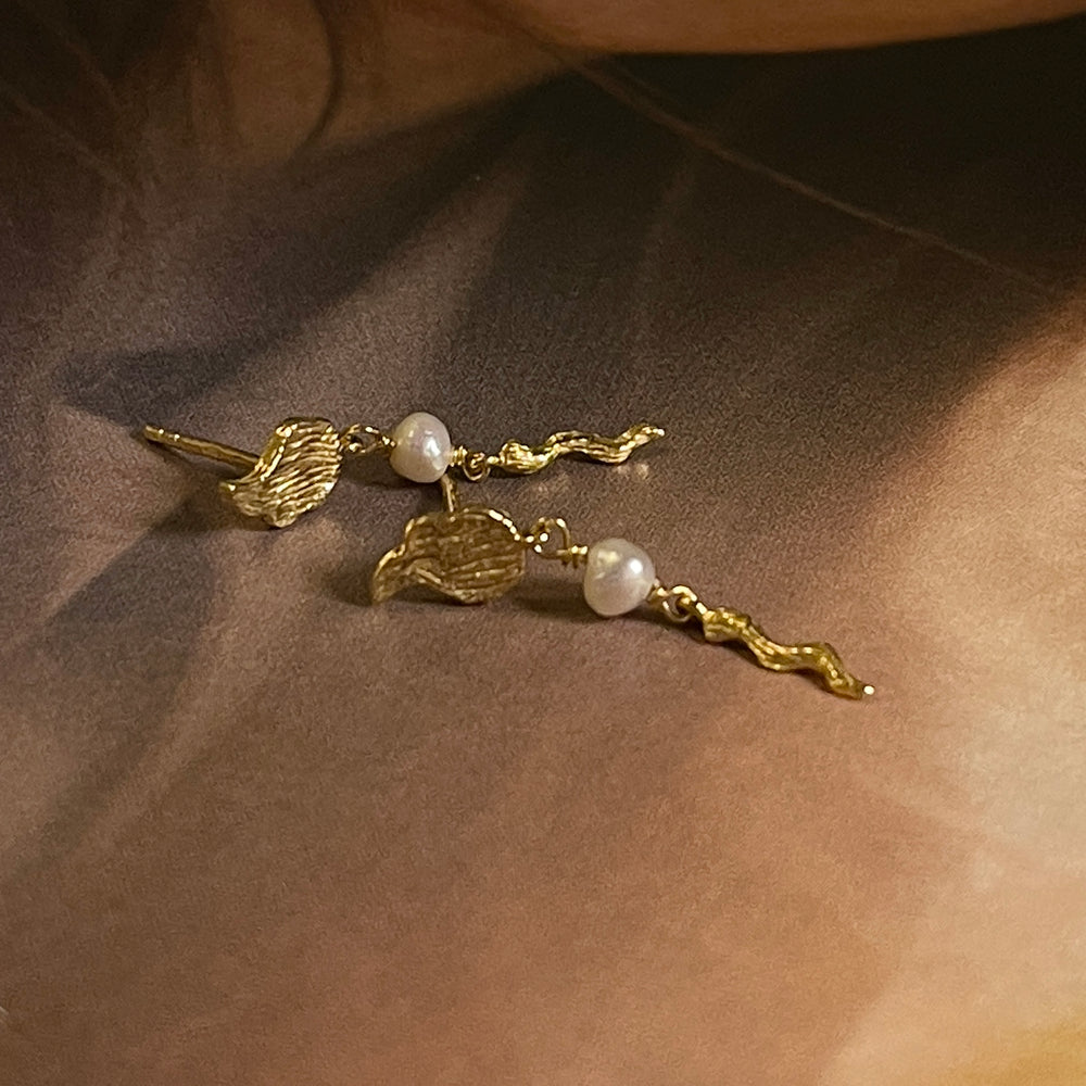 Gold-plated Ophelia Earrings are designed with a Freshwater pearl and a beautifully detailed undulating pendant. Beautiful earrings that go well with both parties and everyday life.