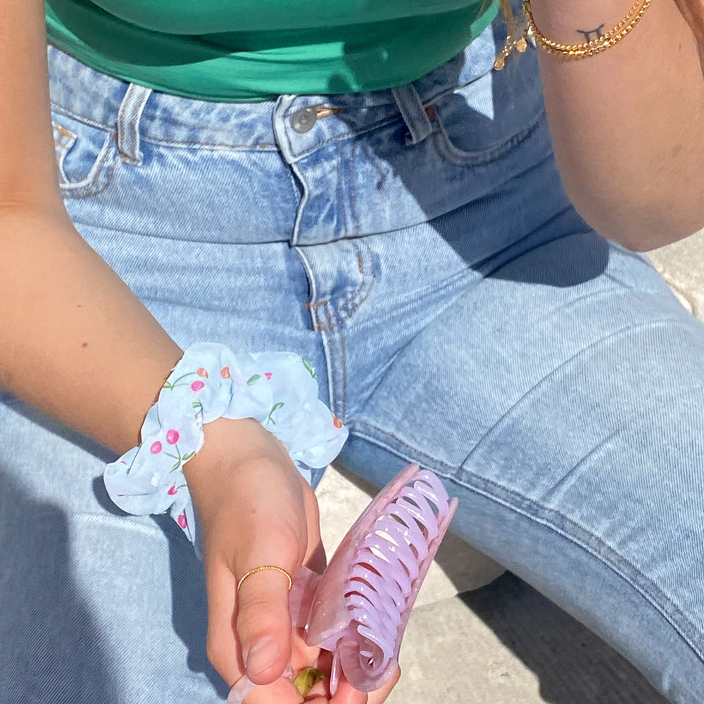Blue Sistie scrunchie with sweet cherries on it, which decorates the hair so nicely. You can also wear it around your wrist, so you always have a hair elastic nearby.