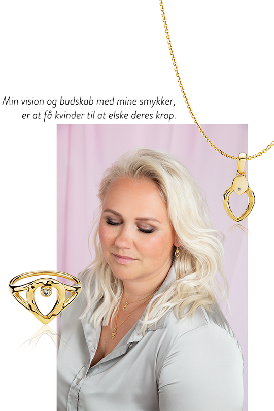 Min vision og budskab med mine smykker, er at få kvinder til at elske deres krop. Vi er heldigvis alle forskellige, vores hud, form og historie er anderledes, og gudskelov for det. Efter to graviditeter, ser min krop helt anderledes ud. Jeg er fyldt med “roadmaps”, det er hvad jeg kalder mine strækmærker og appelsinhud, da de viser hvor jeg har været, og hvad jeg er gået igennem.